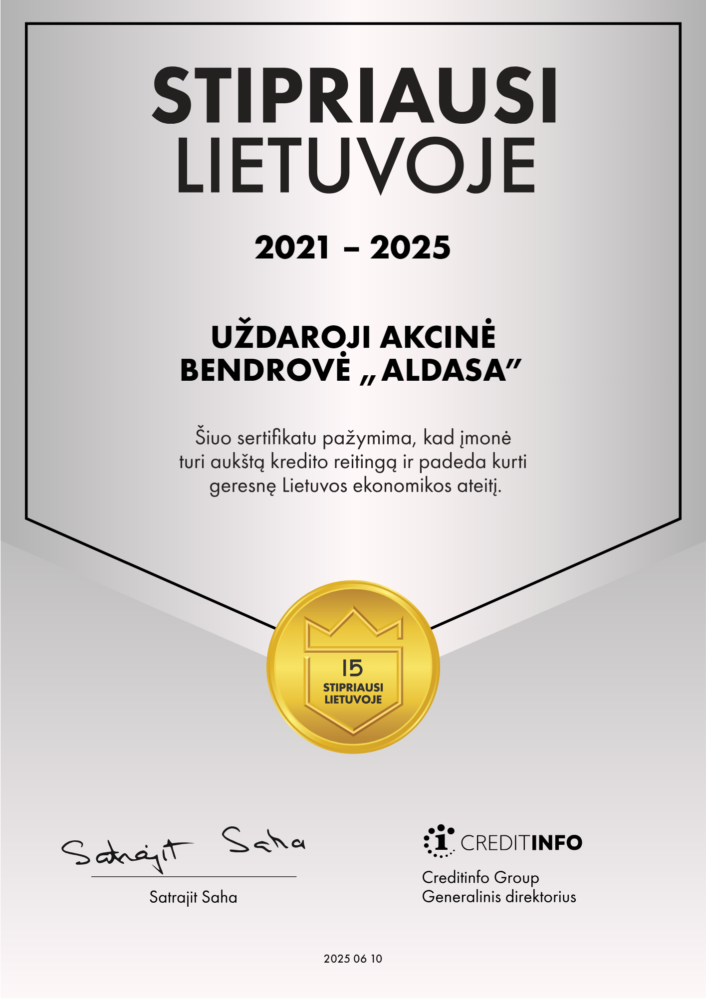 „Stipriausi Lietuvoje“ sertifikatas – jau dvyliktus metus kredito biuro „Creditinfo“ suteikiamas įvertinimas finansiškai patikimoms įmonėms, turinčioms gerą kredito istoriją. Tai – vienas žinomiausių apdovanojimų Lietuvoje, kurį pripažįsta ir tarptautiniai partneriai.